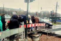 Nie za mięsem, nie za cukrem, a... za zielonym światłem stoi kolejka na przejściu dla pieszych przy rondzie Kocmyrzowskim w Krakowie. Przez niedokończony remont jezdnię z chodnikiem łączy tylko wąski i do tego słabo zabezpieczony betonowy pomost. Miasto cudów!