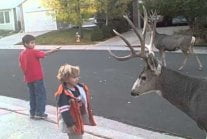 Dzieciaki dokarmiają jelenie.