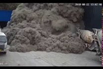 Tony cementu pokrywają plac manewrowy, samochody i ludzi.