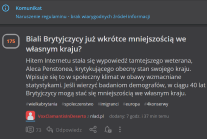 Gdzie informacje w znalezisku były dwie: 1. Cytat Aleca Penstonea (miał miejsce). 2. Informacja o zmianie struktury demograficznej w Wielkiej Brytanii - co akurat jest faktem (nie opinią) - a w niektórych dzielnicach np. Londynu już od lat rdzenni Brytyjczycy stanowią mniejszość. Moderacja się myli